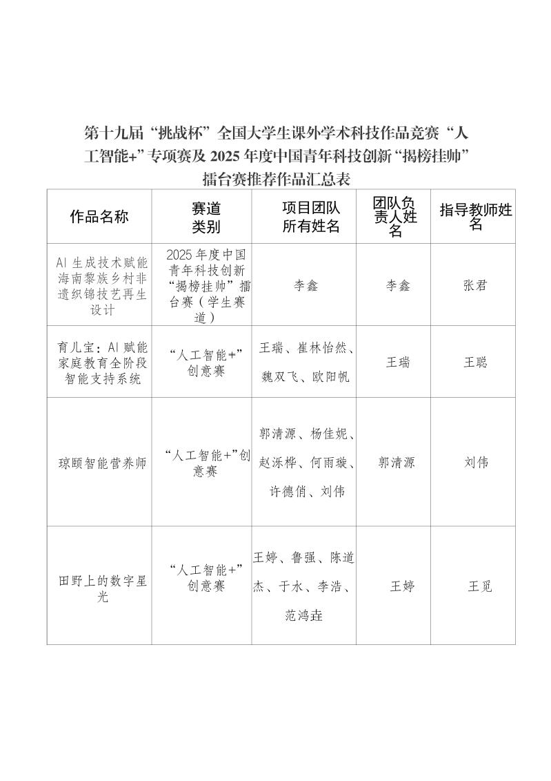 根据团中央《关于开展第十九届“挑战杯”中国大学生课外学术科技作品竞赛作品申报工作的工作提示》要求和竞赛规则,拟推荐我校以下项目参加第十九届“挑战杯”全国大学生课外学术科技作品竞赛“人工智能+”专项赛及2025年度中国青年科技创新“揭榜挂帅”擂台赛(学生赛道)。现将相关信息公示如下,公示期5天(7月29日—8月2日)。公示期内如有异议,请向校团委反映。