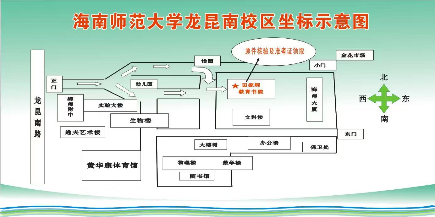 (二)笔试地点:海南师范大学龙昆南校区田家炳教育书院,具体考场安排将于4月11日07:00前在田家炳教育书院楼前公告栏公布。龙昆南校区坐标示意图详见本公告附件2。